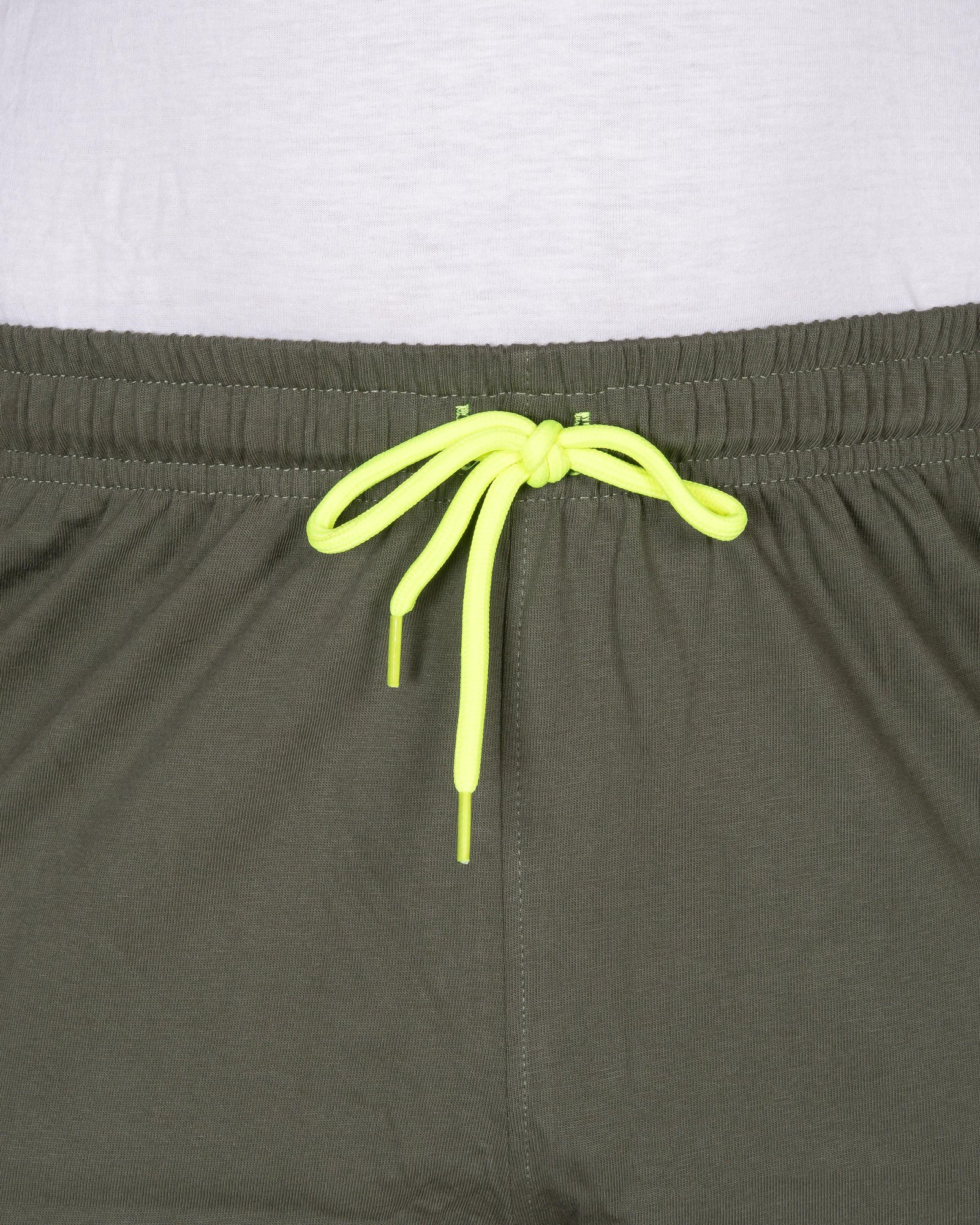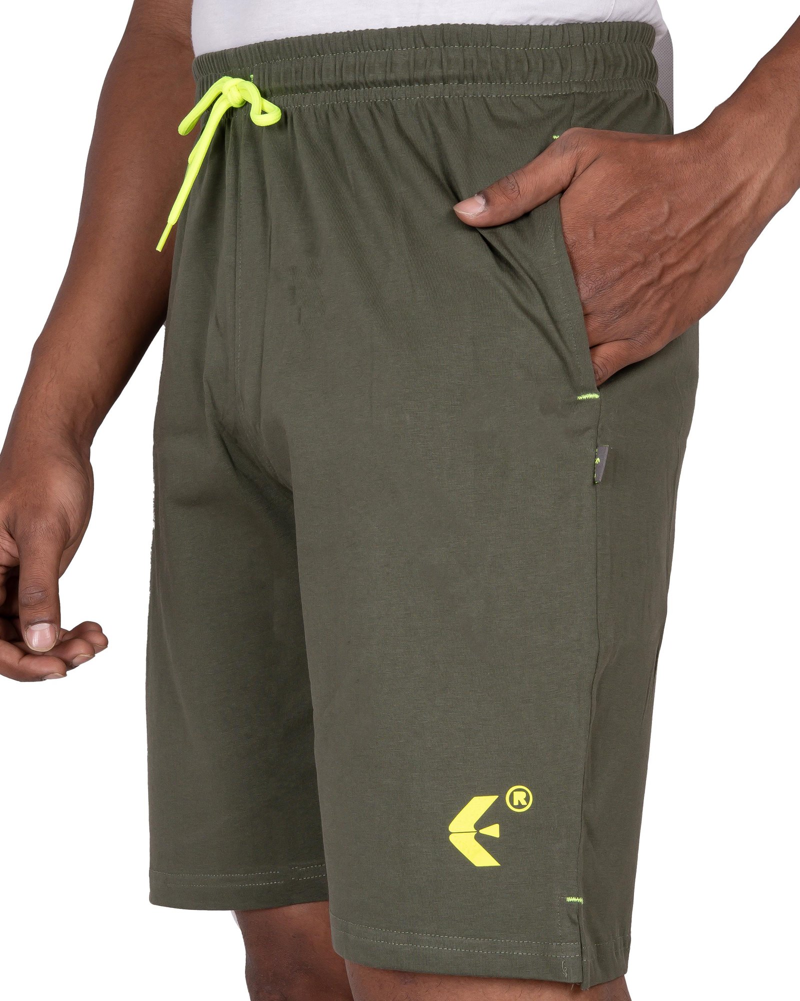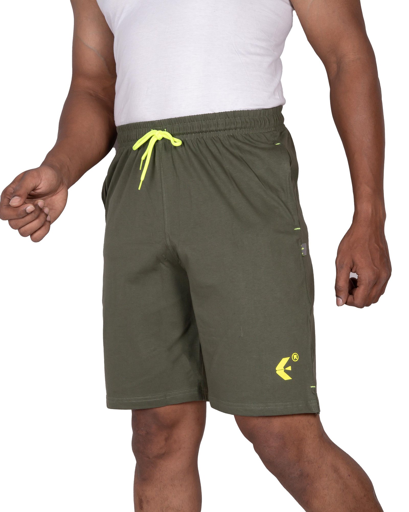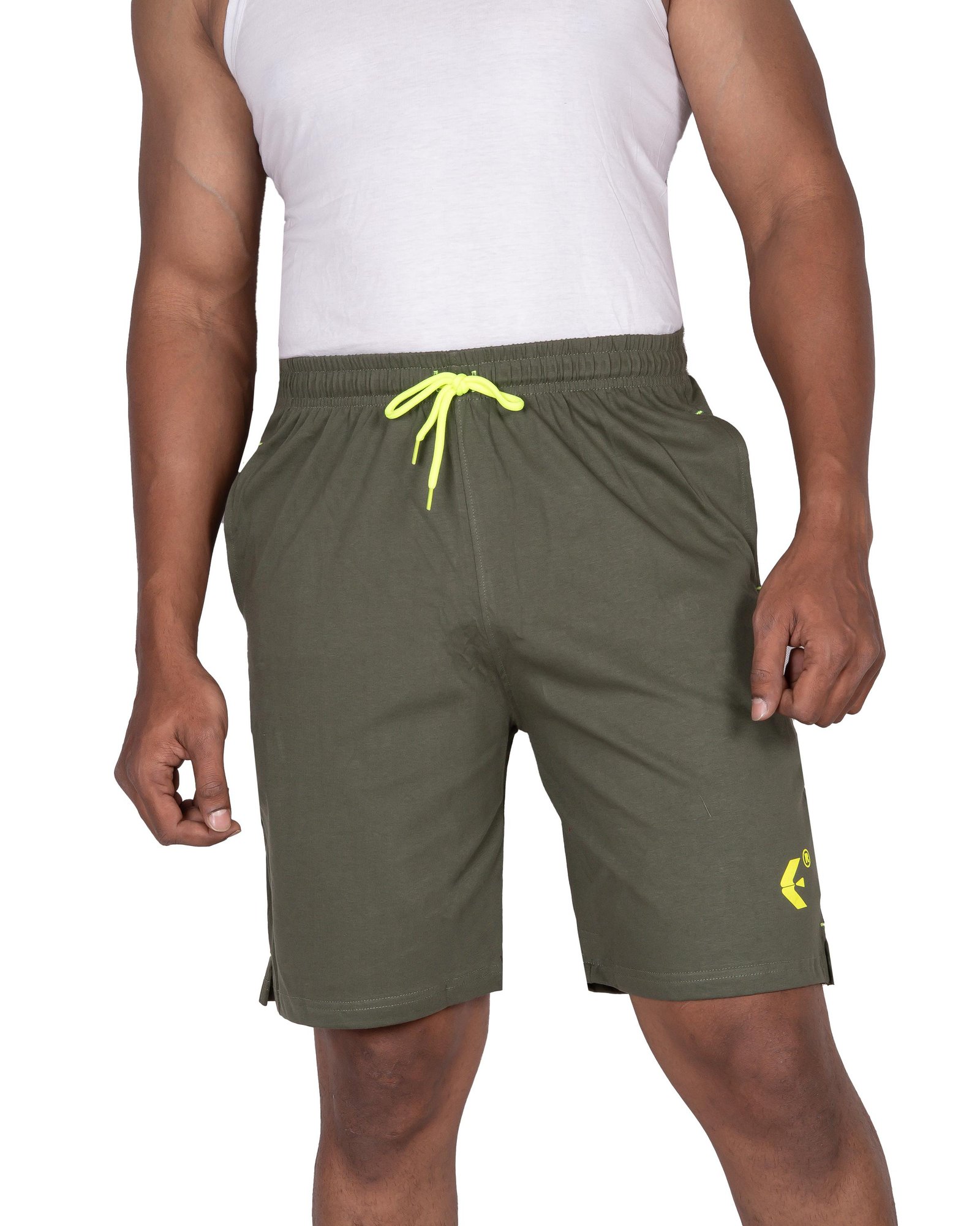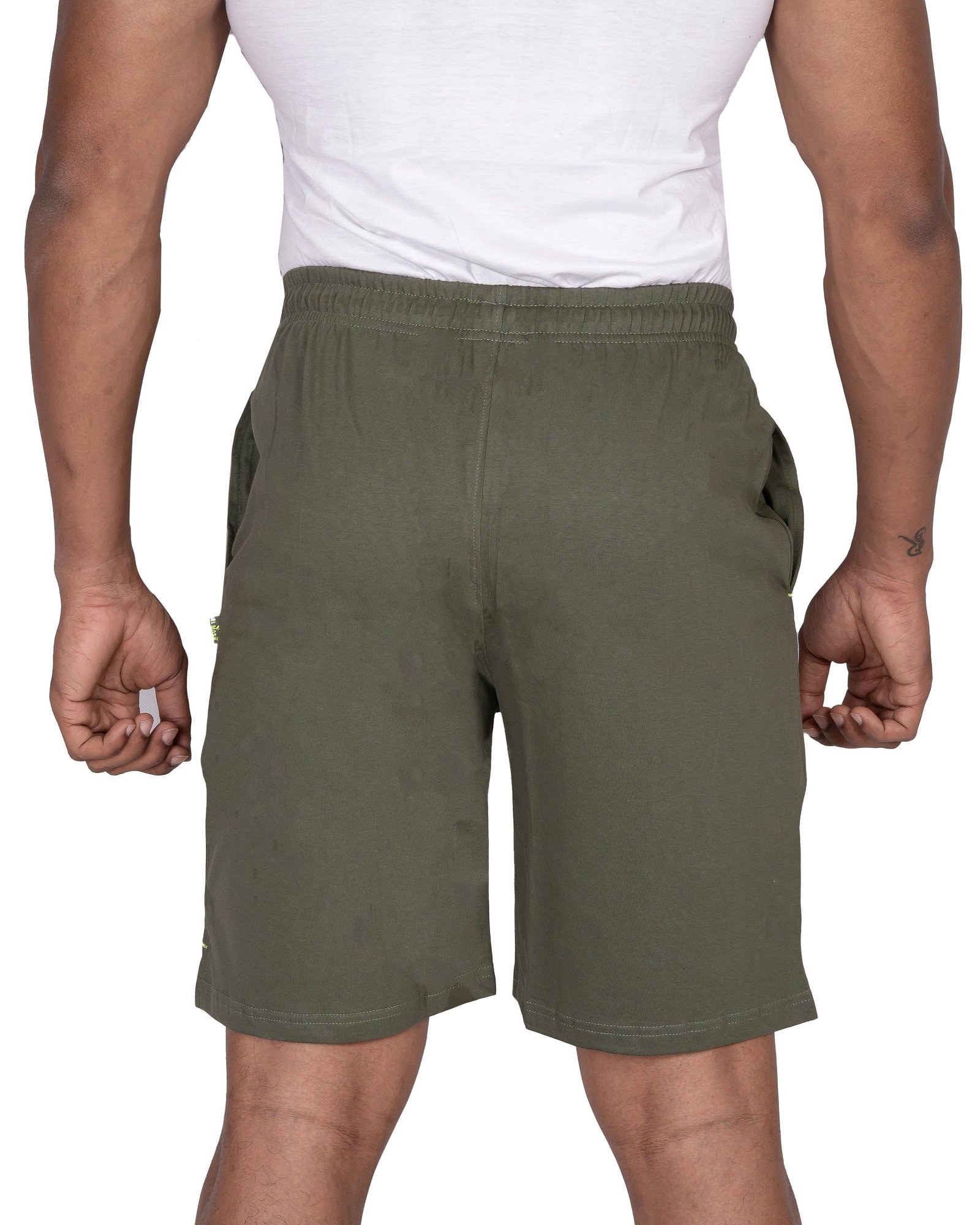 These men’s olive green athletic shorts combine rugged style with everyday performance. The earthy olive tone delivers a strong, versatile look, while the neon drawstring adds a bold sporty contrast. Designed with a comfortable regular fit, they allow unrestricted movement without excess bulk. The elastic waistband ensures a secure and adjustable fit for workouts or casual wear. Crafted from lightweight, breathable fabric, these shorts help maintain comfort during gym sessions, running, or daily activities. Functional side pockets provide convenience, and the subtle logo detailing keeps the design clean. Durable, flexible, and practical, these shorts are built for active lifestyles.