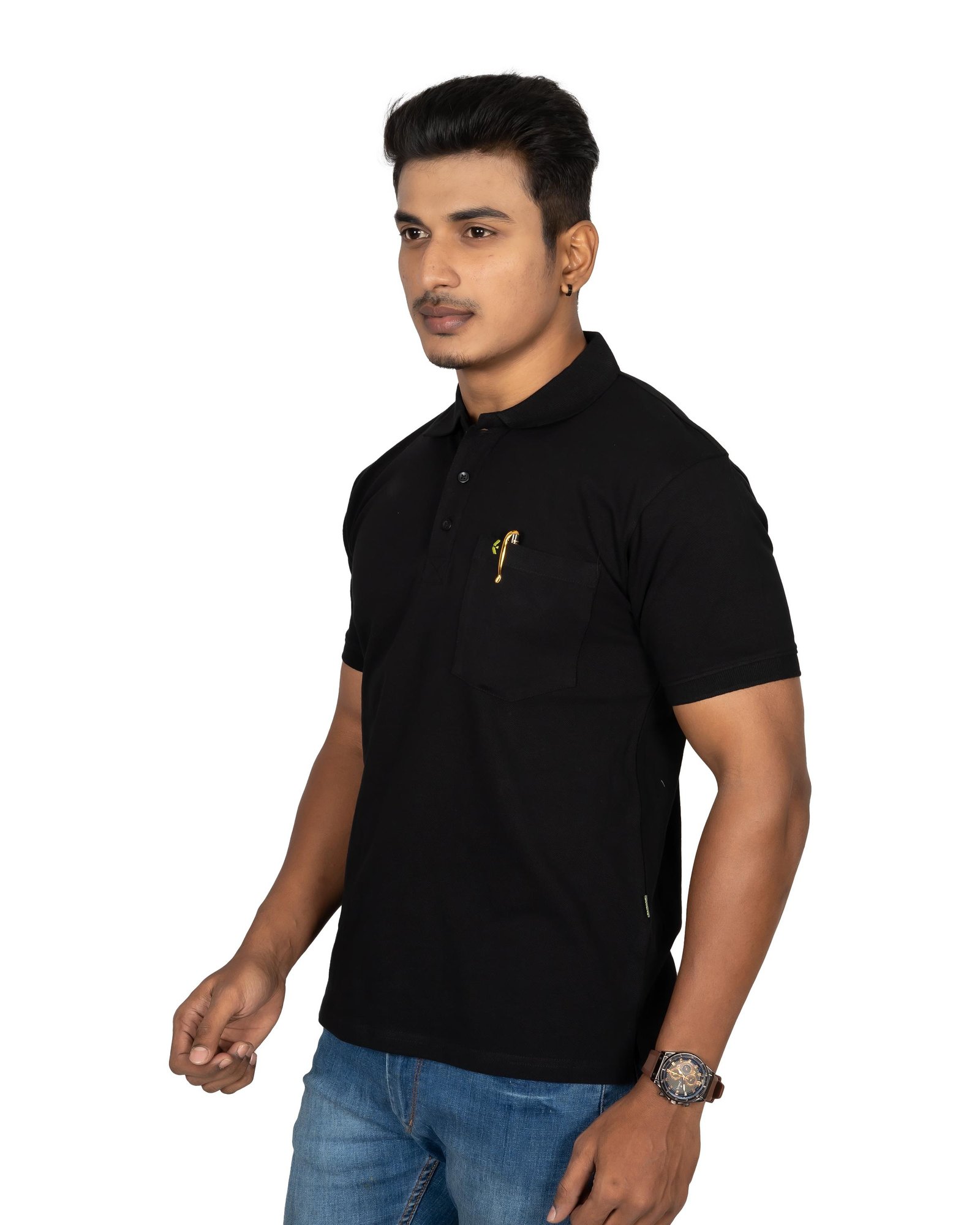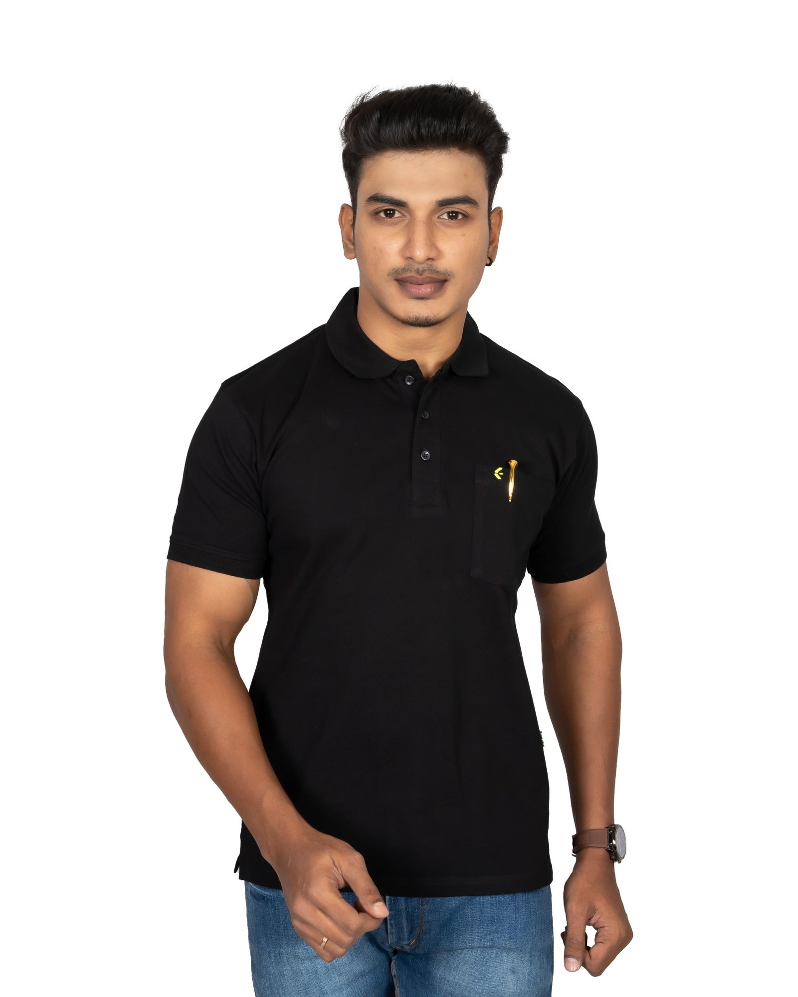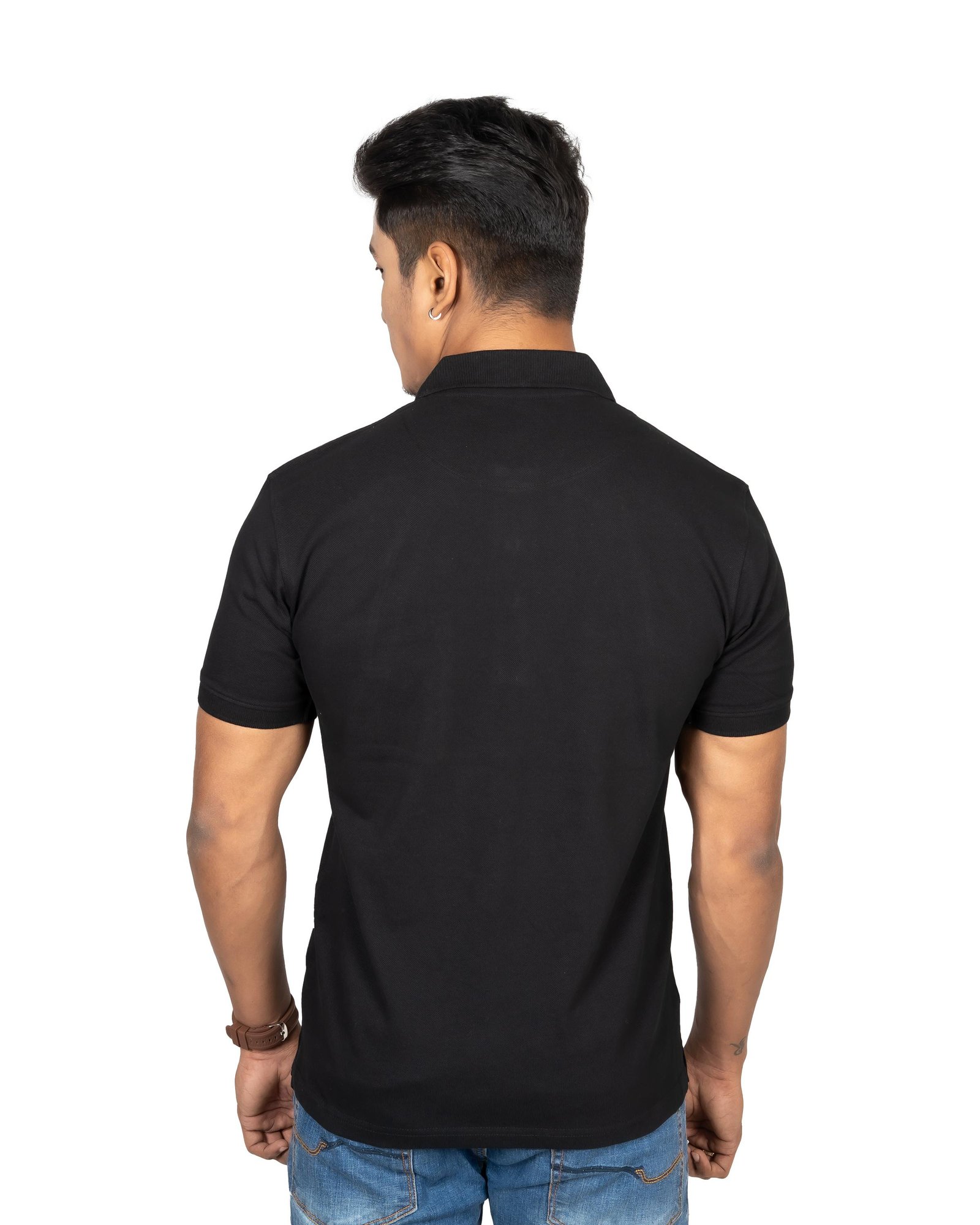 Upgrade your everyday style with this premium black solid polo t-shirt designed for modern men. Made from soft, breathable cotton fabric, it offers superior comfort for all-day wear. The classic collar with button placket adds a smart touch, while the minimal chest logo keeps the look clean and elegant. Perfect for casual outings, office wear, or evening gatherings, this versatile t-shirt pairs effortlessly with jeans or chinos. The durable stitching ensures long-lasting quality and shape retention after multiple washes. A must-have wardrobe essential that combines comfort, simplicity, and timeless fashion in one stylish piece for every season.